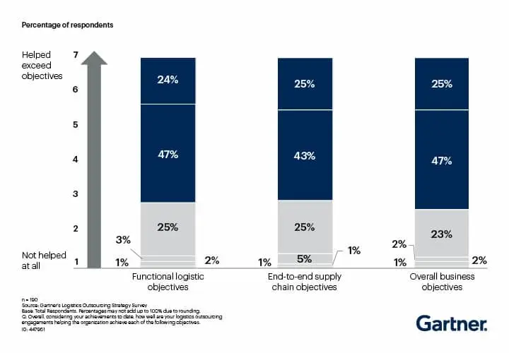 Ökningen av logistikoutsourcing antas bero på att det stöttar affären. 70 % av respondenterna uppger att funktionella mål, end-to-end mål och företagsövergripande mål har mötts eller överträffats med hjälp av outsourcing till externa aktörer, exempelvis till tredjepartslogistiker/3PLs .