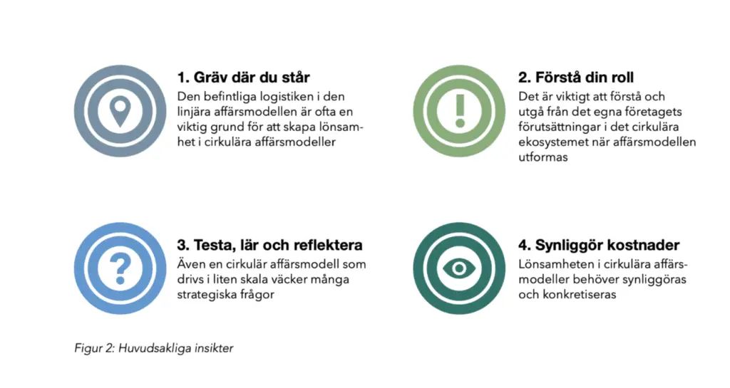 En viktig första insikt bygger på att det befintliga, linjära logistiksystemet spelar en viktig roll vid utformningen av cirkulära flöden. Den linjära logistiken utgör ofta en stabil grund som kan anpassas och byggas vidare på. Eventuella butiker, lager, IT-system och samarbeten med logistikleverantörer som redan finns på plats kan användas även för insamling, sortering och hantering av cirkulära produkter. Genom att integrera de nya flödena med de gamla kan synergieffekter och kostnadsbesparingar skapas. Samtidigt är det viktigt att påpeka att det befintliga logistiksystemet också sätter gränserna för vilken eller vilka cirkulära affärsmodeller som är realistiska och möjliga att genomföra och det gäller därmed att förstå på vilket sätt den linjära verksamheten kan utnyttjas.