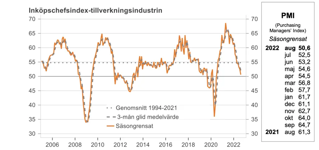Pristrycket från leverantörsledet sjunker i snabb takt. Index för rå- och insatsvarupriser, som var oförändrat i augusti på 61,6, har fallit med närmare 20 indexenheter under de senaste tre månaderna och är nu på nivåer som inte uppmätts sedan 2020. – – Ett lägre pristryck från leverantörsledet sker samtidigt som leveranstiderna faller tillbaka, vilket antyder om att leveransstörningarna i industrin har minskat under hösten, säger Jörgen Kennemar.